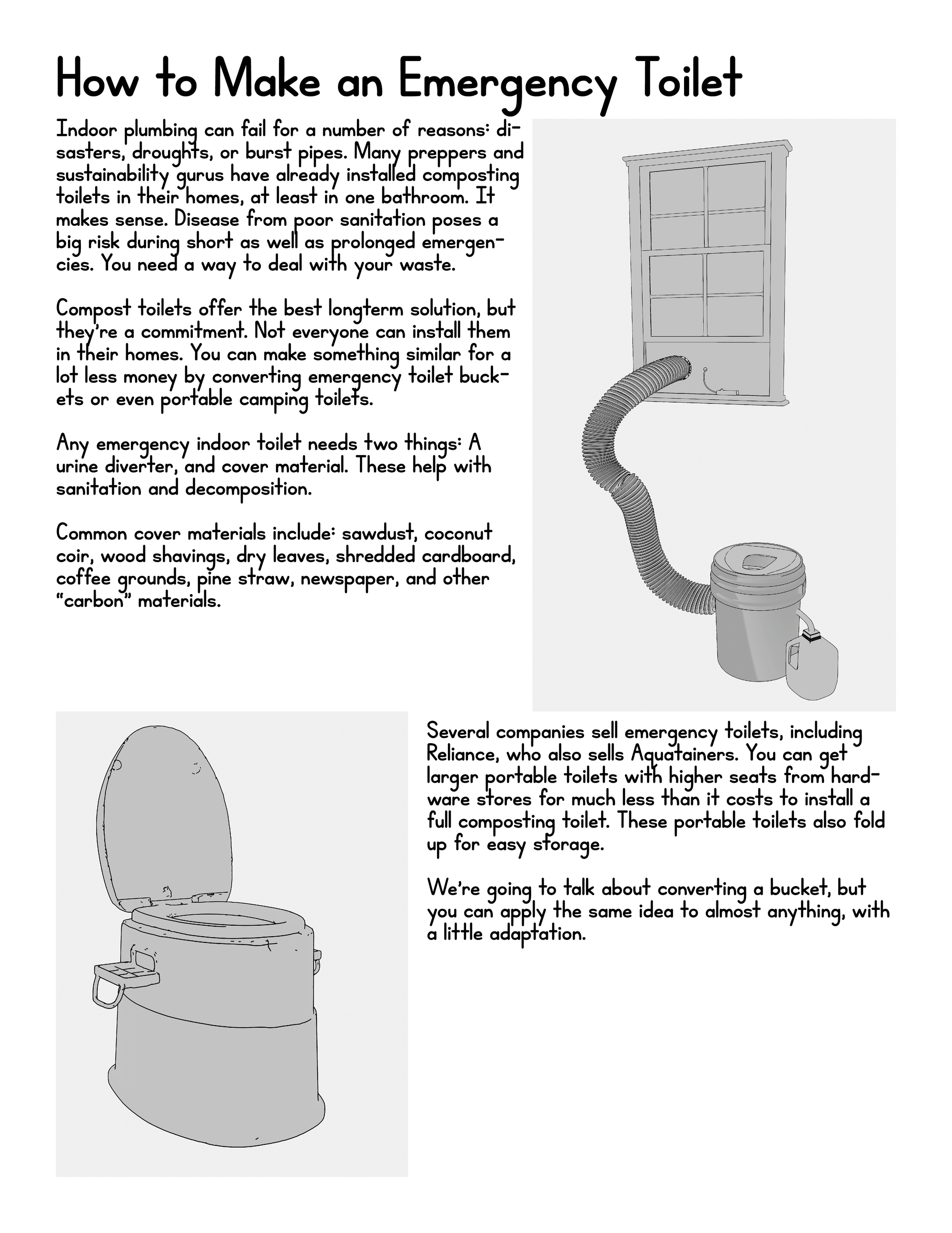 As promised, I'm working on sanitation. It's another key element of survival. Without it, we won't last long. I'll be drafting material on outhouses, latrines, and longer term situations. For now, especially given the immediate risk of burst pipes, I've posted a short guide to making an emergency dry toilet. It's a simple enough design, something you can set up and take down. You can do it with a bucket, or a portable toilet with a higher seat. It solves a problem a few people have raised, about needing an option for those of us who can't install a full composting toilet.